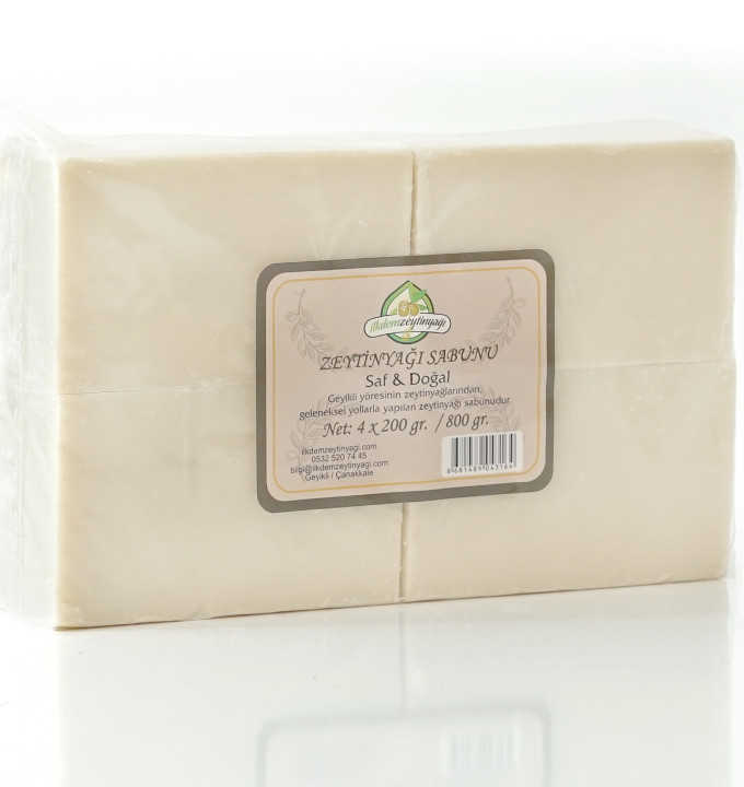 Kendi zeytinliğimizin yağlarından üretilmiştir.İçindekiler : Zeytinyağı, Sabun bazı, Deniz tuzu, Su.Hiçbir hayvansal yağ içermez.4 x 200 gr = 800 gr.